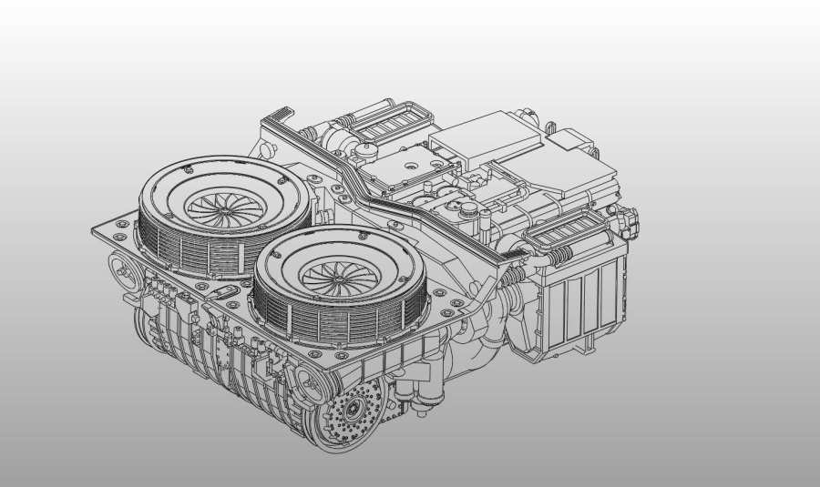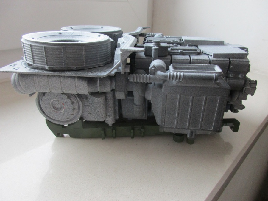 Nachbildung des Antriebs eines "Leo2" Panzers. Das Modell besteht aus mehreren Teilen um die Konstruktion zu "entzerren" aber auch als Erleichterung für späteres Lackieren oder die Anbringung weiterer Details. Das Modell ist hohl so das es deutlich leichter (Gewicht ca. 450gr) als vergleichbare Resinguss Modelle ist.